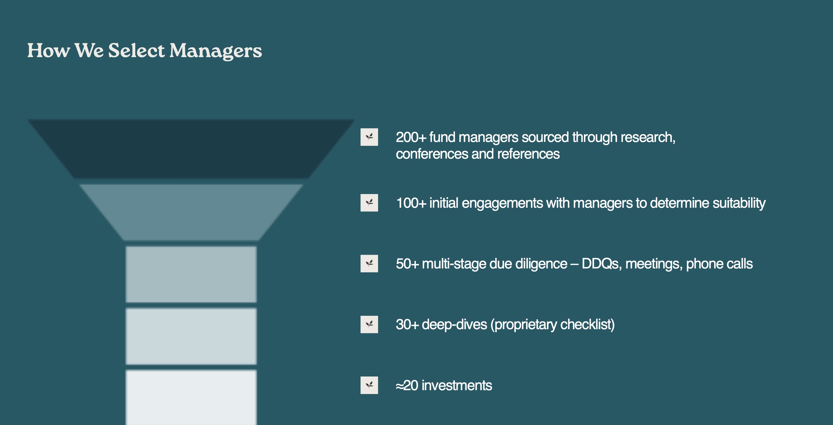 • Possesses a proven fund manager selection methodology - proprietary checklist, due diligence, and regular reviews.